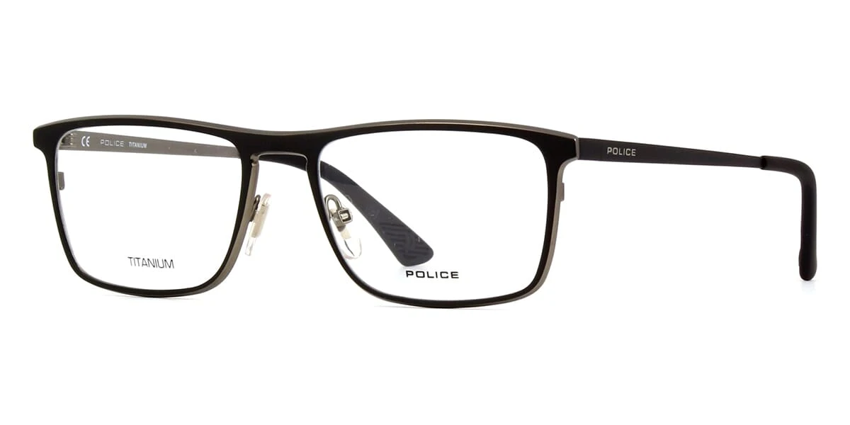 This square Police optical comes in a matte black and dark ruthenium frame.