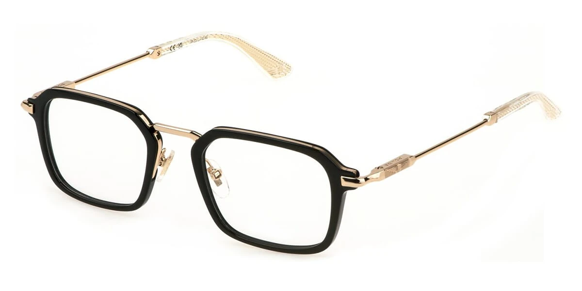 This square Police optical comes in a shiny black with rose gold frame.