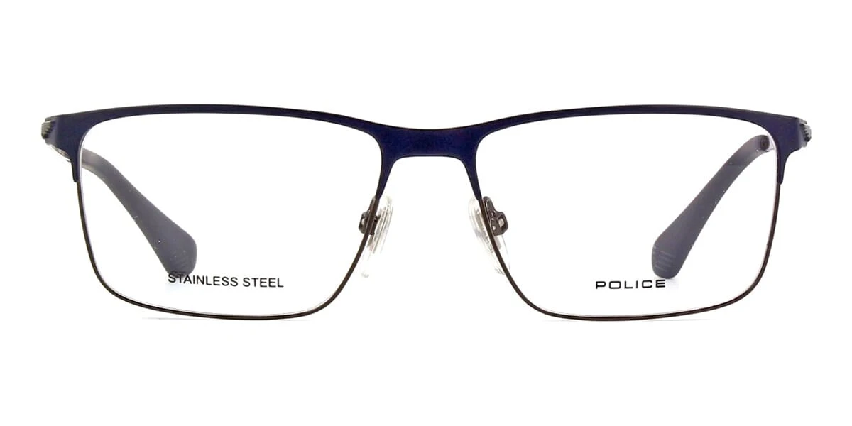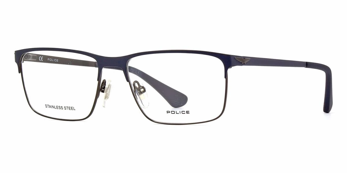 This square Police optical comes in a matte dark navy and shiny dark gunmetal frame.