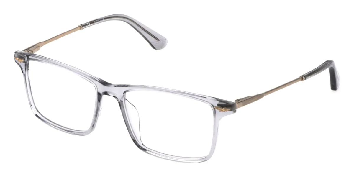 This rectangular Police optical comes in a transparent grey with gold frame.