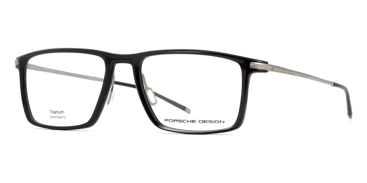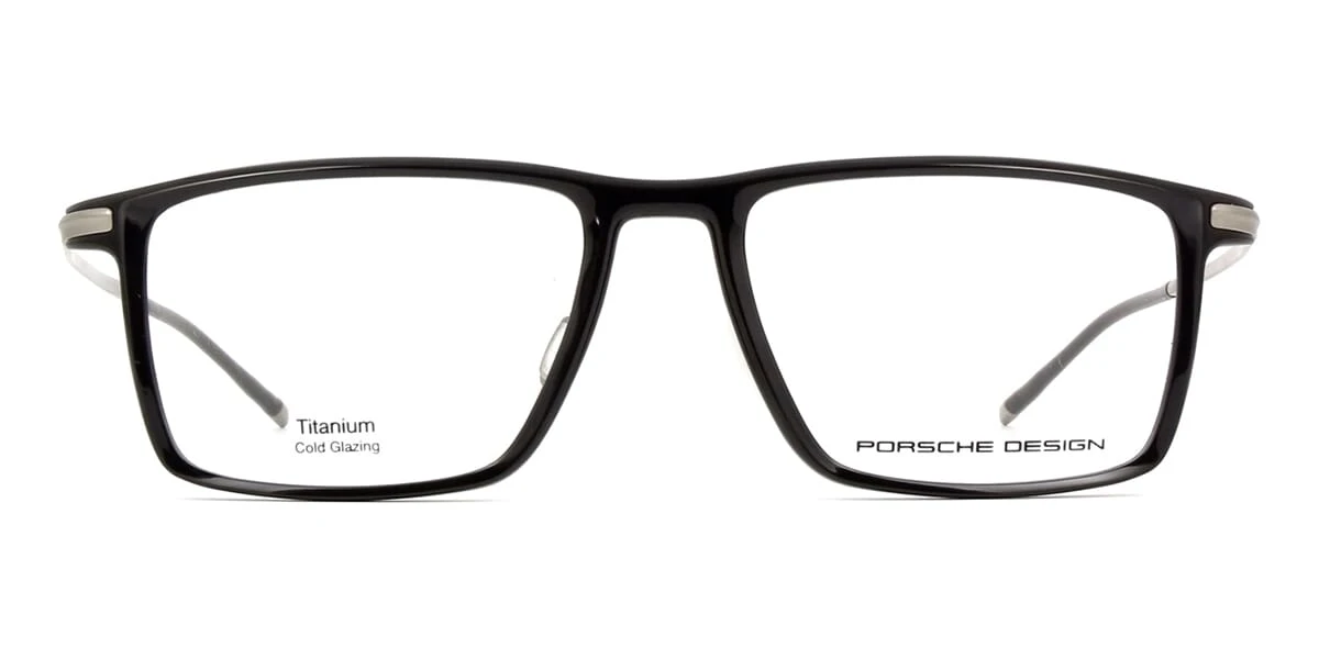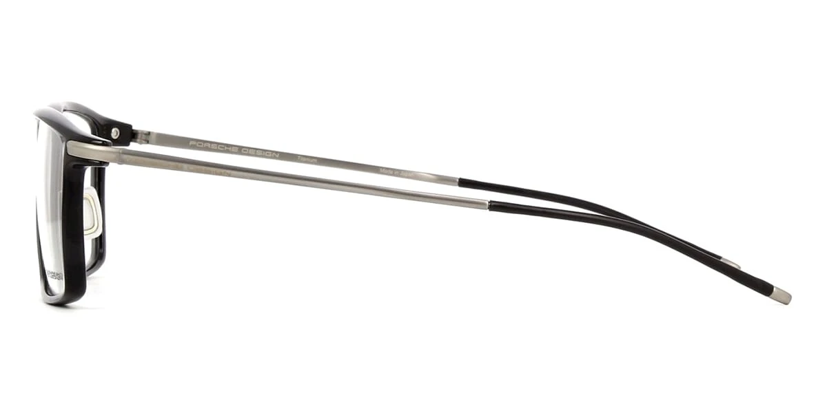 This square Porsche Design optical comes in a shiny black with matte ruthenium frame.