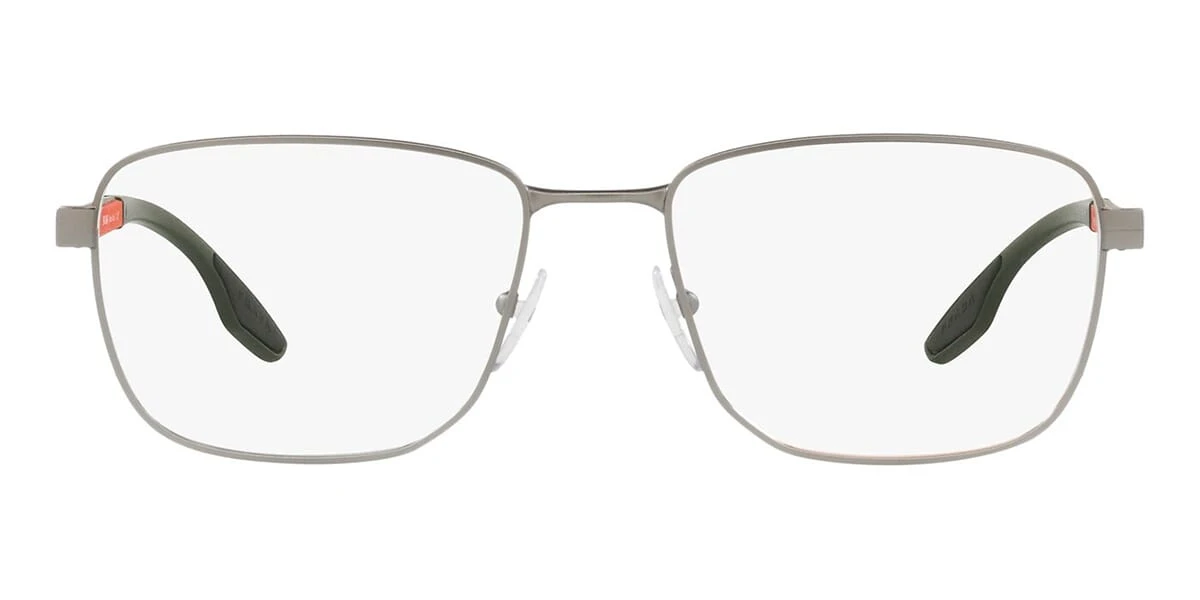 This rectangular Prada Linea Rossa optical comes in a matte gunmetal frame.