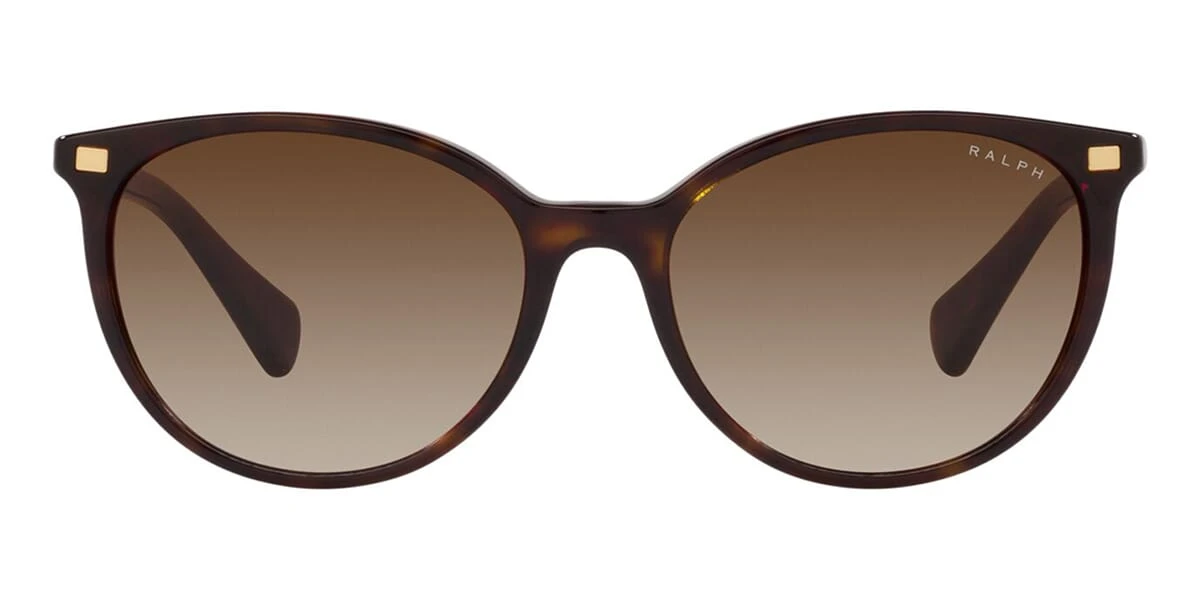 This round Ralph by Ralph Lauren sunglass comes in a shiny dark havana frame with gradient brown lenses.