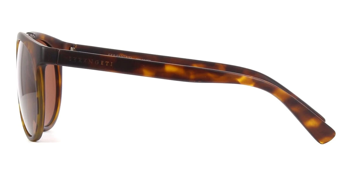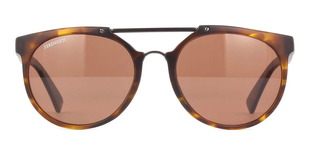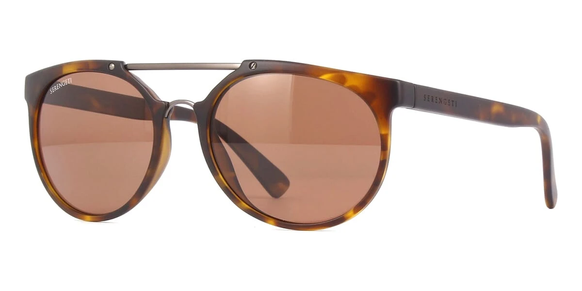 This round Serengeti sunglass comes in a matte dark tortoise and matte dark gunmetal frame with brown driver spectral control photochromic polarised mineral lenses.