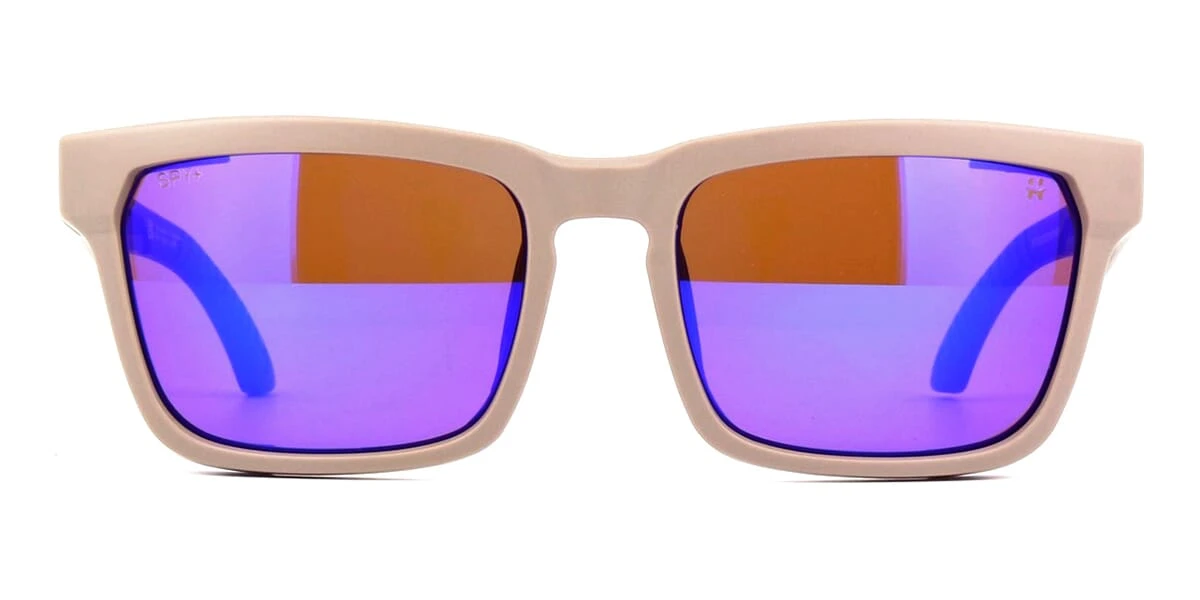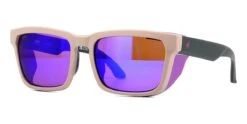 This square Spy sunglass comes in a beige with black frame with brown with blue mirror lenses.
