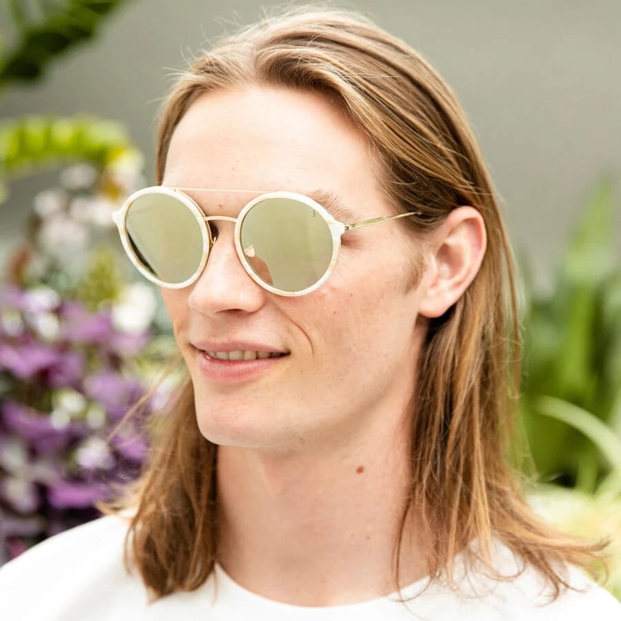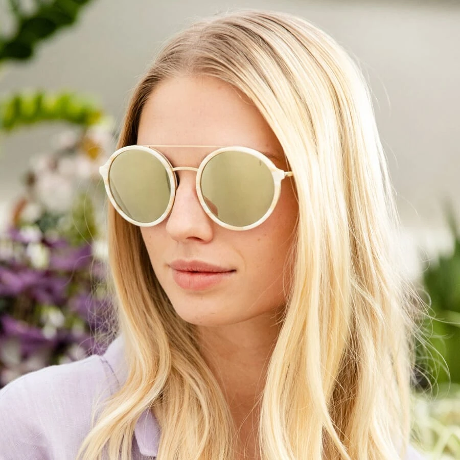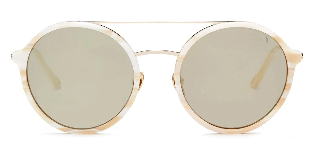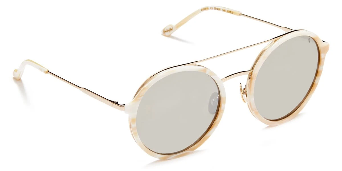 This round Sunday Somewhere sunglass comes in a marble white and gold frame with grey cat 3 lenses.