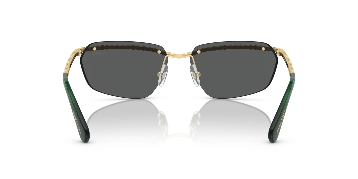 This rectangular Swarovski sunglass comes in a gold frame with dark grey lenses.