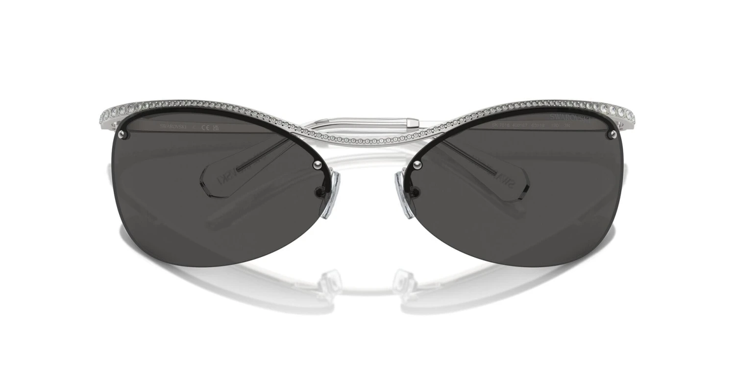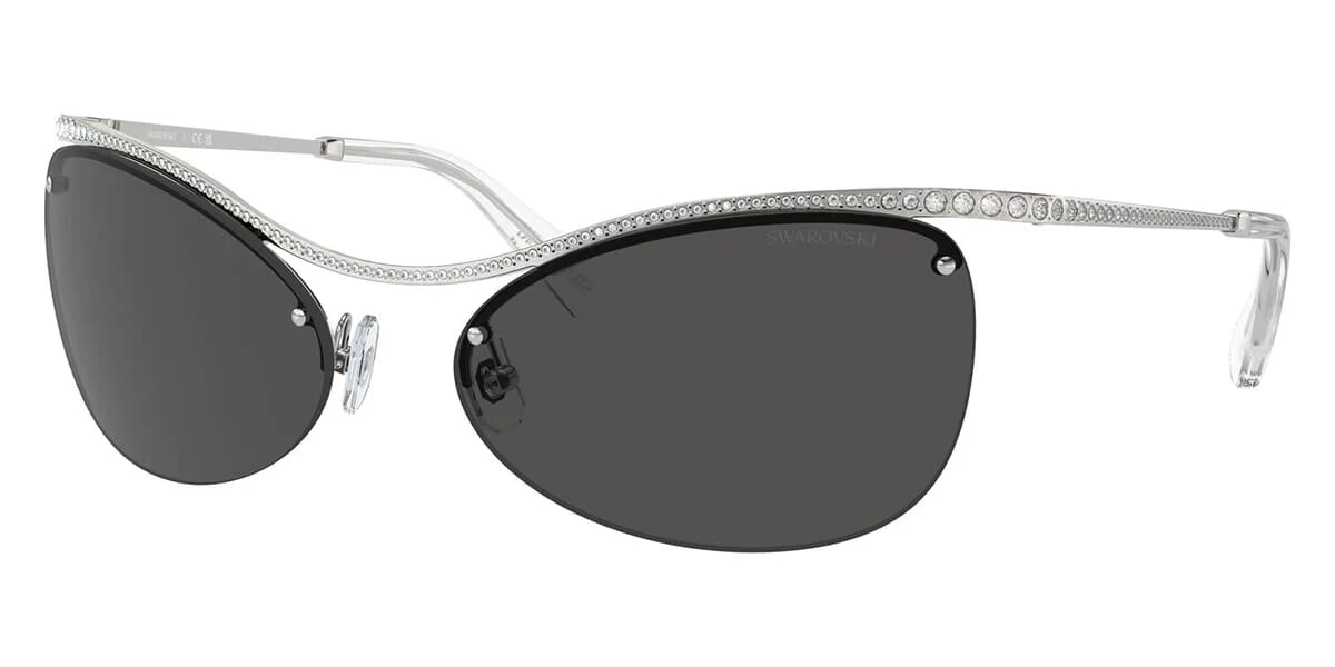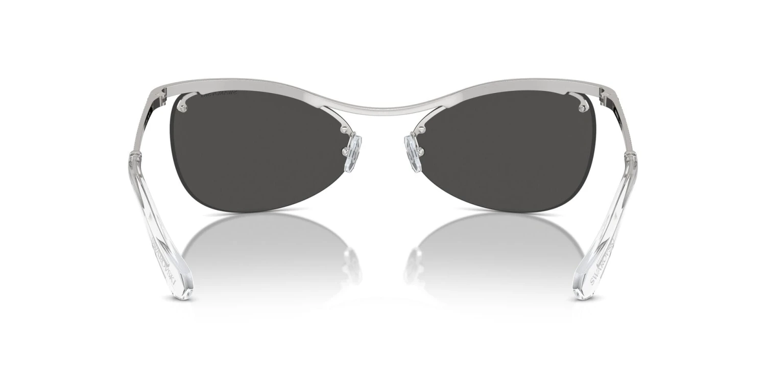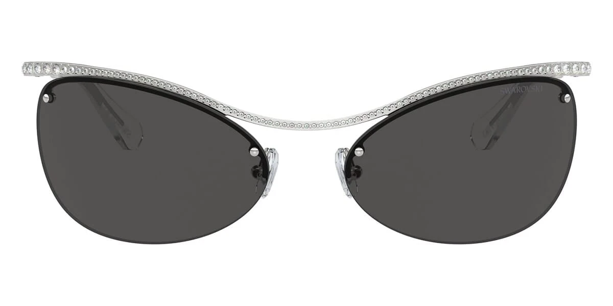 This cat eye Swarovski sunglass comes in a silver frame with dark grey lenses.