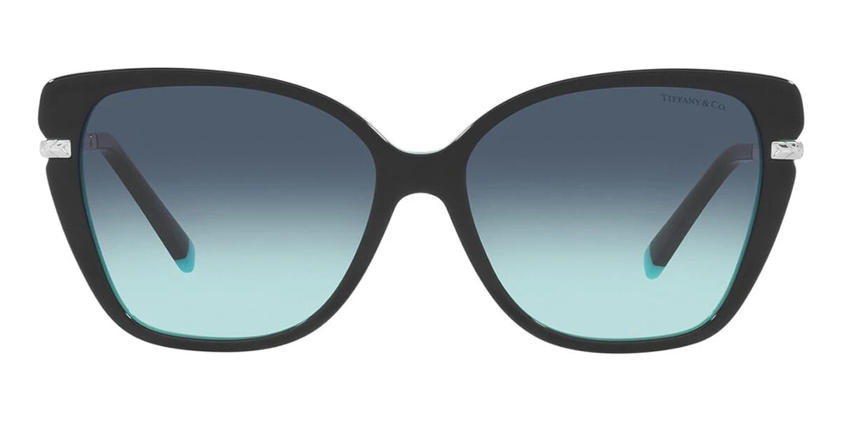 This cat eye Tiffany sunglass comes in a black on tiffany blue frame with azure to blue gradient lenses.