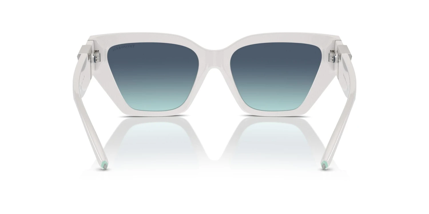 This cat eye Tiffany sunglass comes in a bright white frame with azure to blue gradient lenses.
