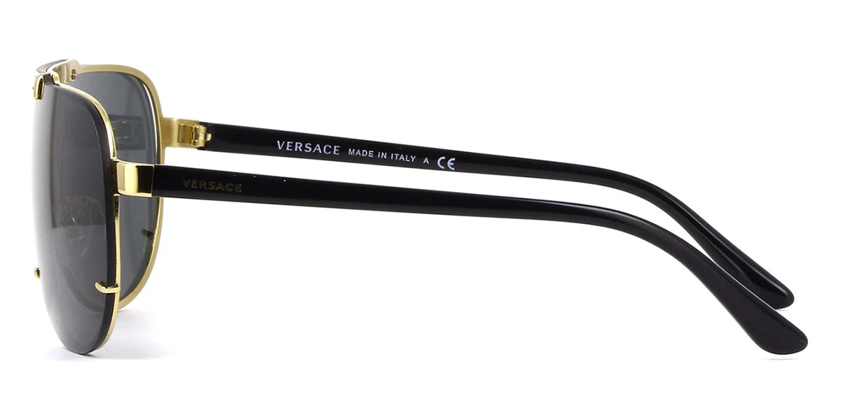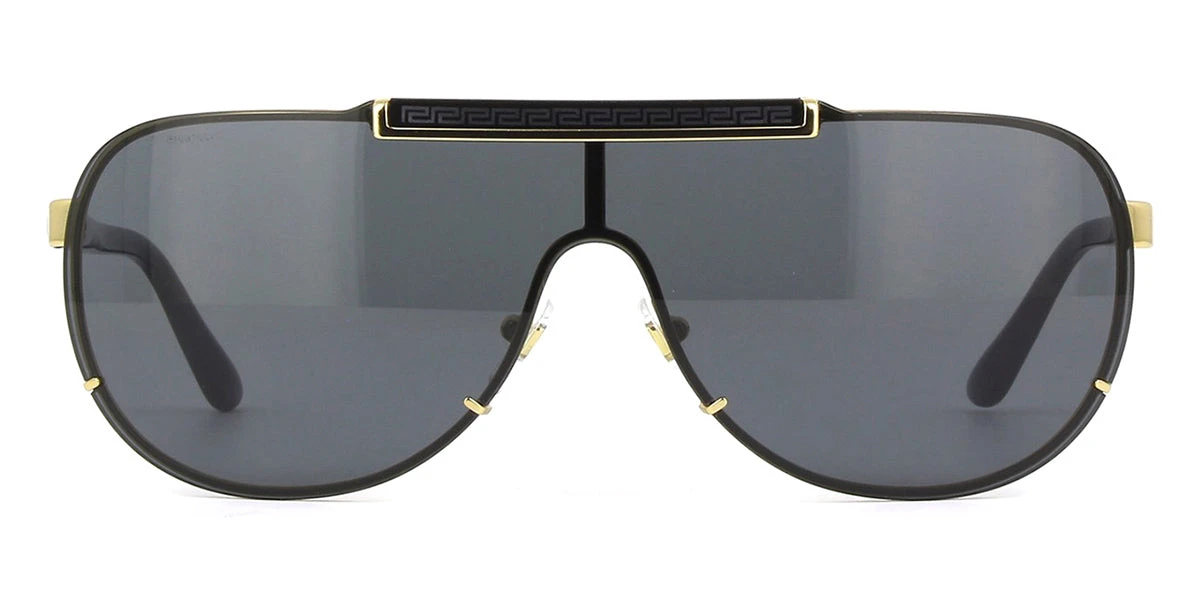 This shield Versace sunglass comes in a gold frame with grey lenses.