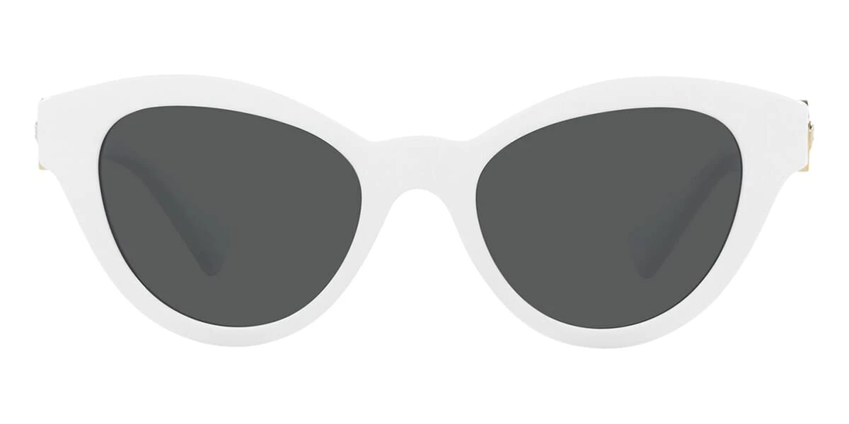 This round Versace sunglass comes in a white frame with dark grey lenses.