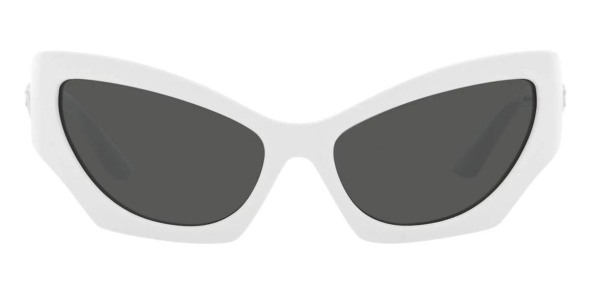 This cat eye Versace sunglass comes in a white frame with dark grey lenses.