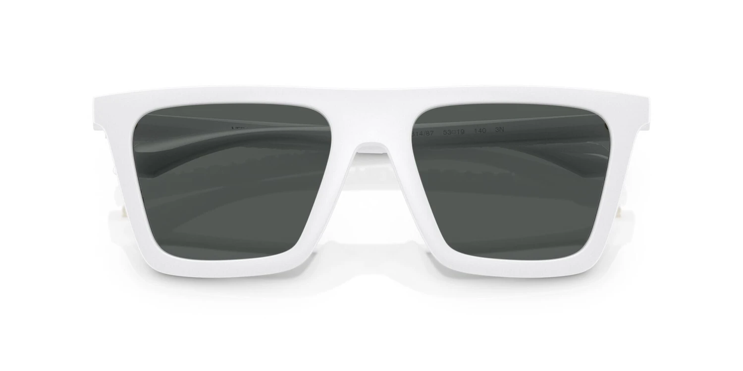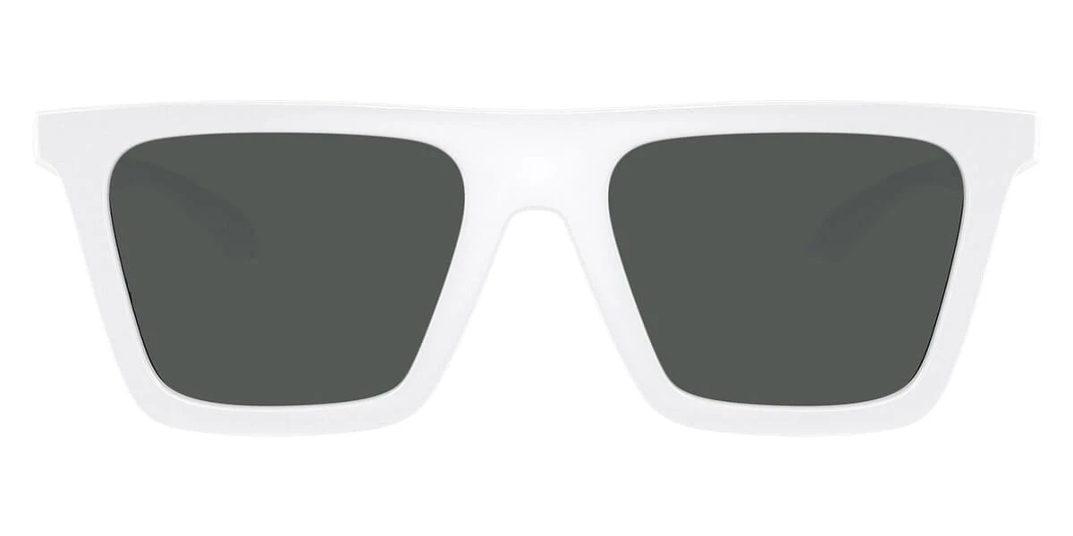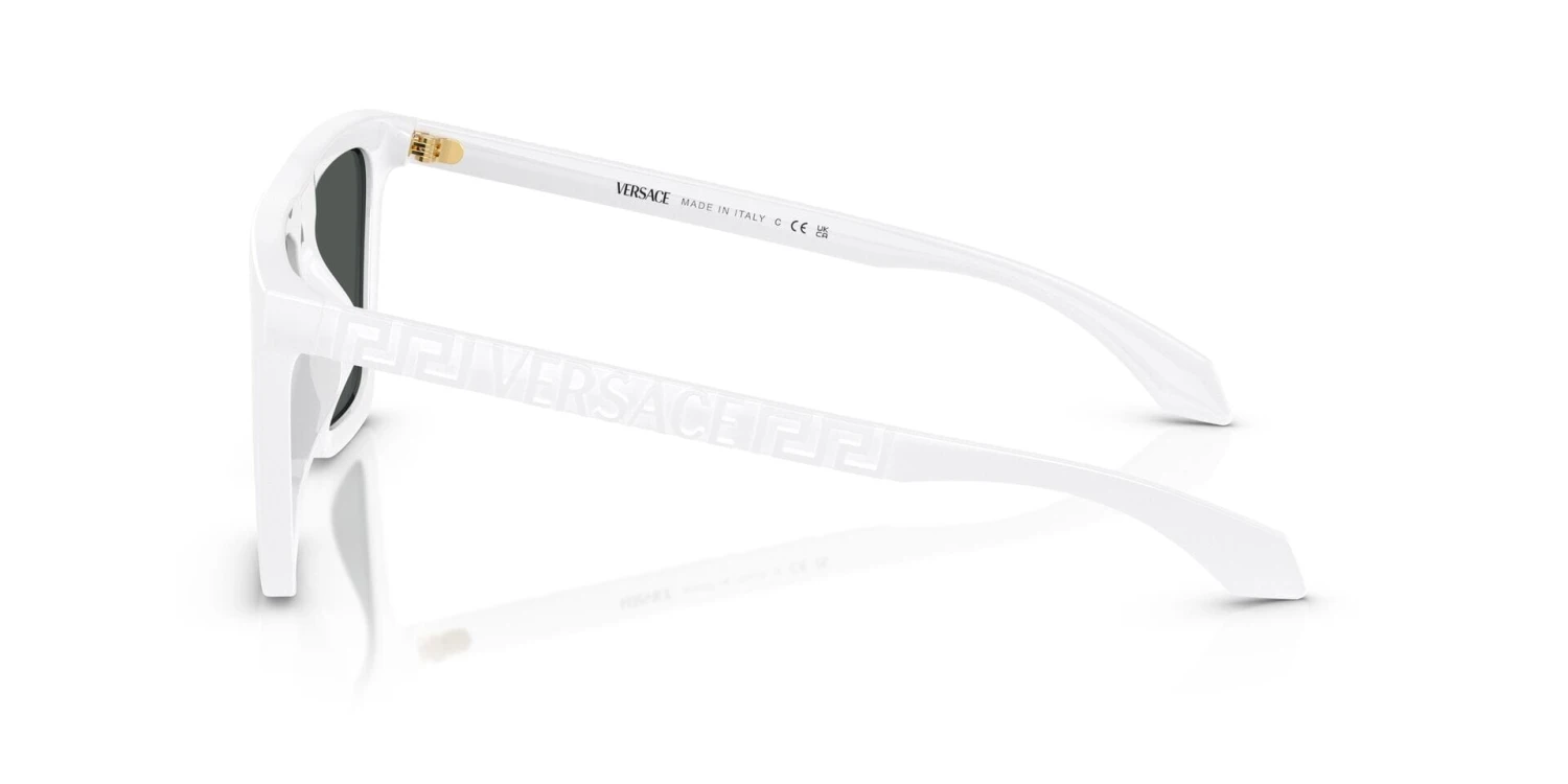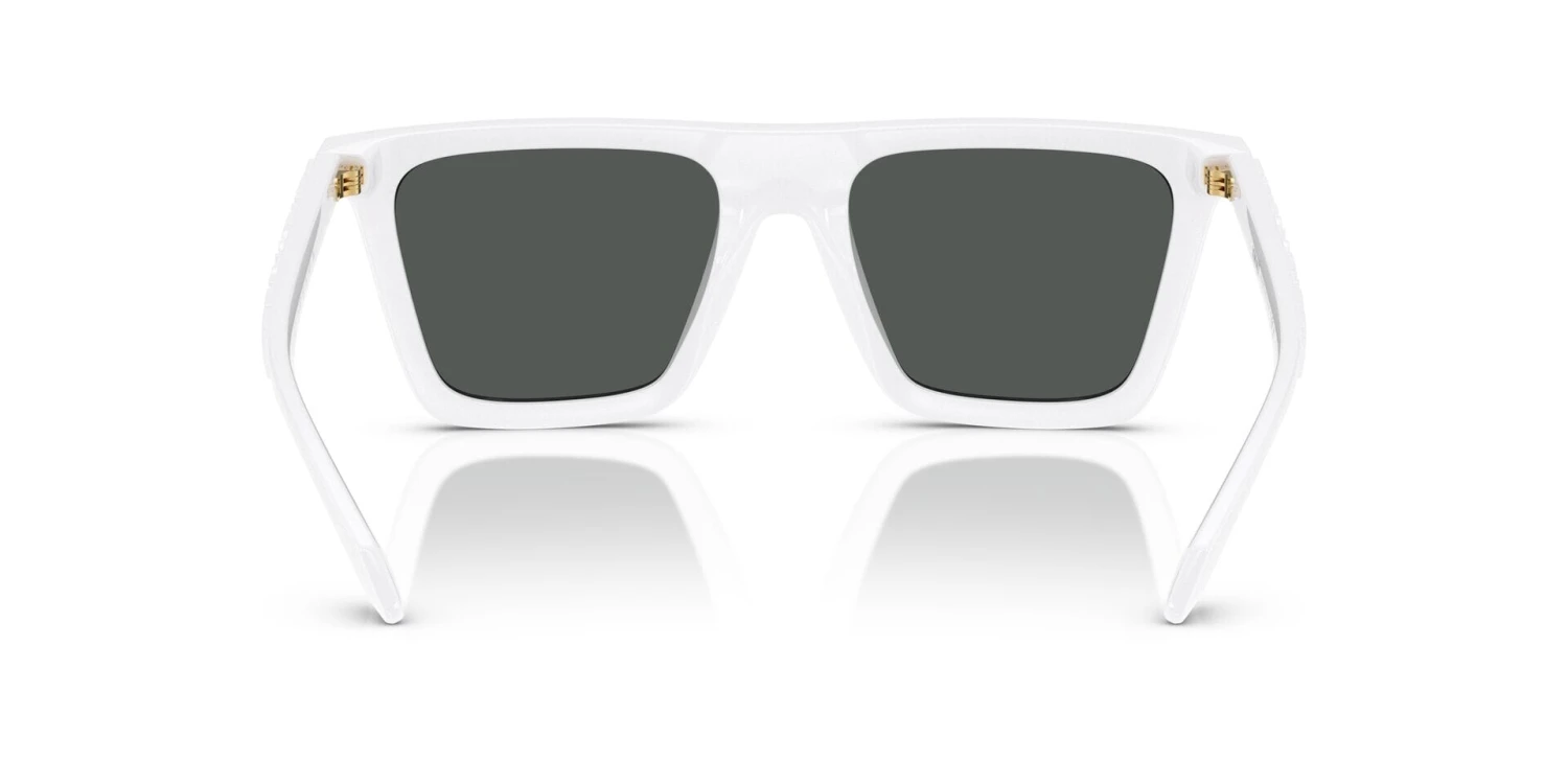This square Versace sunglass comes in a white frame with dark grey lenses.