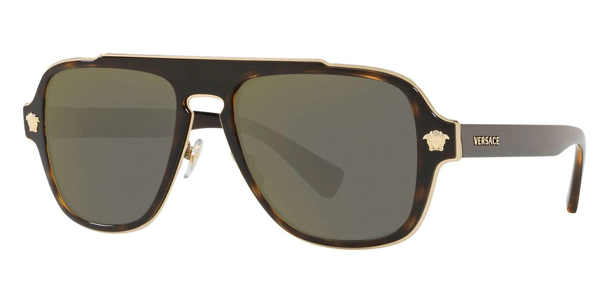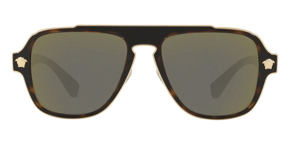 This square Versace sunglass comes in a dark havana frame with dark grey with gold mirror lenses.